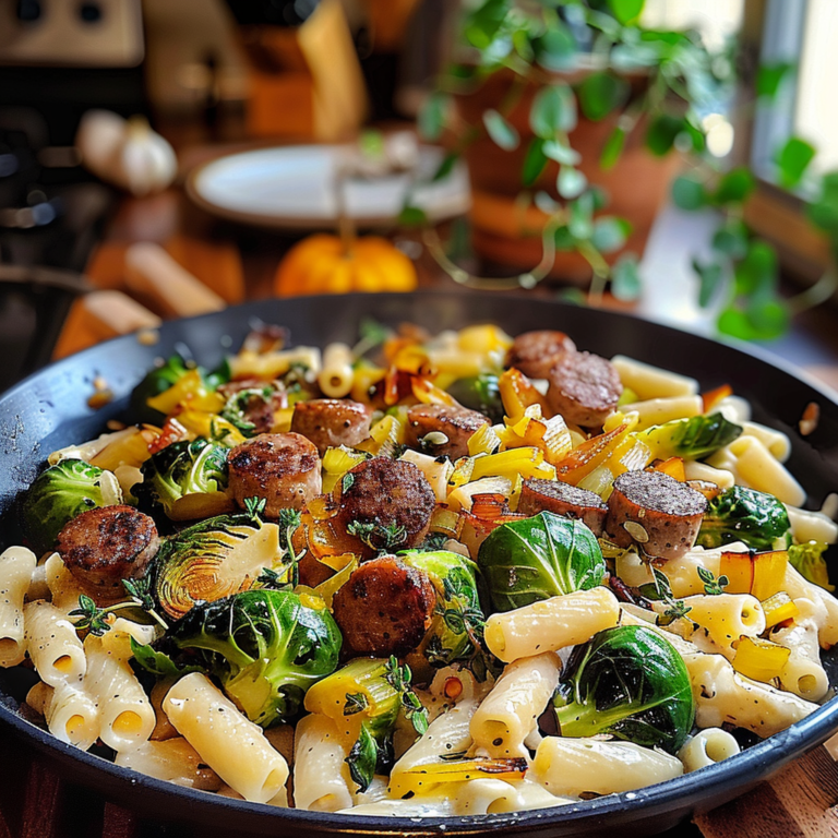 Cozy Autumn Dinner: Sausage, Pasta, Brussels Sprouts Delight