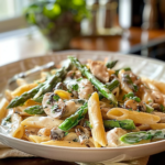Creamy Mushroom and Asparagus Chicken Penne is a heartwarming dish that combines tender chicken, earthy mushrooms, and vibrant asparagus in a luscious cream sauce, all enveloped in al dente penne pasta. Perfect for weeknight dinners or impressing guests, this comforting meal is sure to become a family favorite. With its rich flavors and delightful aroma, every bite offers a cozy embrace that warms the soul.