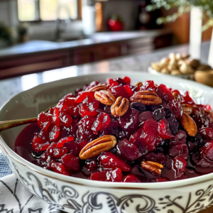 Cranberry relish with toasted pecans is a vibrant burst of flavor and texture that dances on your palate. This irresistible dish combines sweet, tart cranberries with the warm crunch of toasted pecans, making it not just a side, but the life of the holiday party. Delightful Ocean Spray Cranberry Relish.