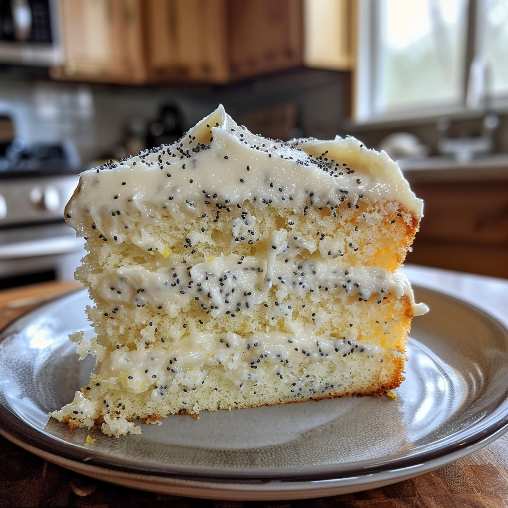 Enjoy every delicious slice of this moist lemon poppy seed cake with creamy frosting!